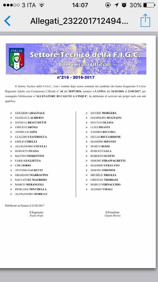 La settimana scorsa si e’ completato il ciclo di lezioni per l’abilitazione ad allenatori di Calcio a 5.Ricca la presenza di allenatori dal sud pontino partendo da Michele Treglia fino a qualche settimana coach della Gymnastic Studio Fondi,proseguendo con Emilio Cibelli attuale mister della Vis Fondi Femminile,ancora Roberto Scotti attuale mister del Formia1905,insieme a lui ci sono Emilio Caringi da Terracina,Fabio Guglietta ex alletore dell’Atletico Sperlonga ,Antonio Lauretti giocatopre nonchè mister delle giovanili della Virtus Fondi,Ciro Iorio ex Formia1905 Femminile ex Maracana’ Femminile e Vis Fondi Femminile,Matteo Olleia attuale mister del Real Terracina,Massimo Stravato attuale all.della Vis Fondi Maschile.Non sono da dimenticare anche se non fanno parte del gruppo del sud pontino Graziano Marracino attuale mister della Virtus Latina Scalo e Cristian Trobiai dell’United Aprilia.