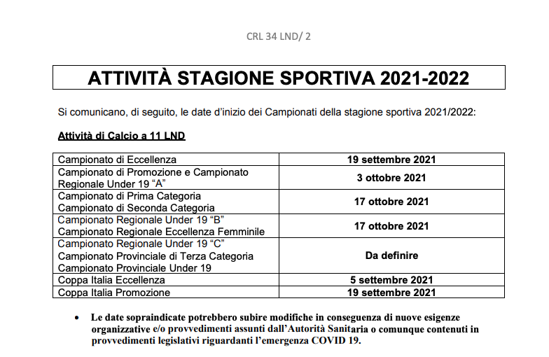 Definite le date inizio campionati regionali e Coppa Italia Luglio 1, 2021 Comunicato Stampa Ecco le date ufficiali per l’inizio dei campionati regionali da Eccellenza fino a seconda categoria . Post Views: 56